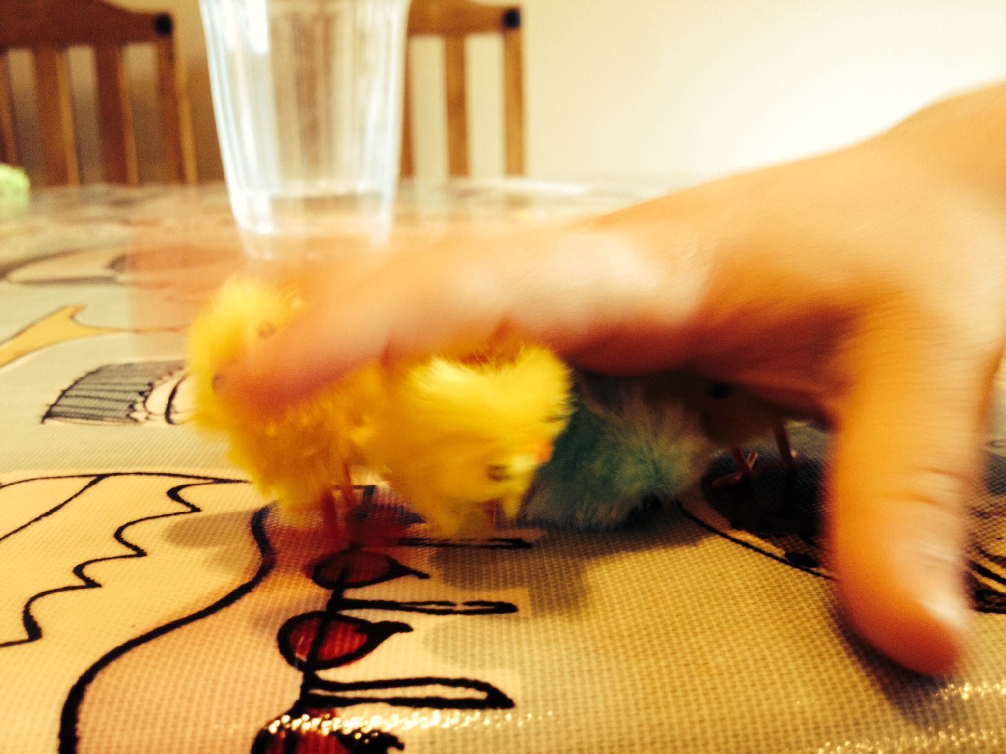 • They got a load of these chicks and they insisted on giving them baths.The glue didn’t hold them together very well so their legs, eyes, beaks and wings fell off! They want me to glue them back together somehow.Lol! :o)