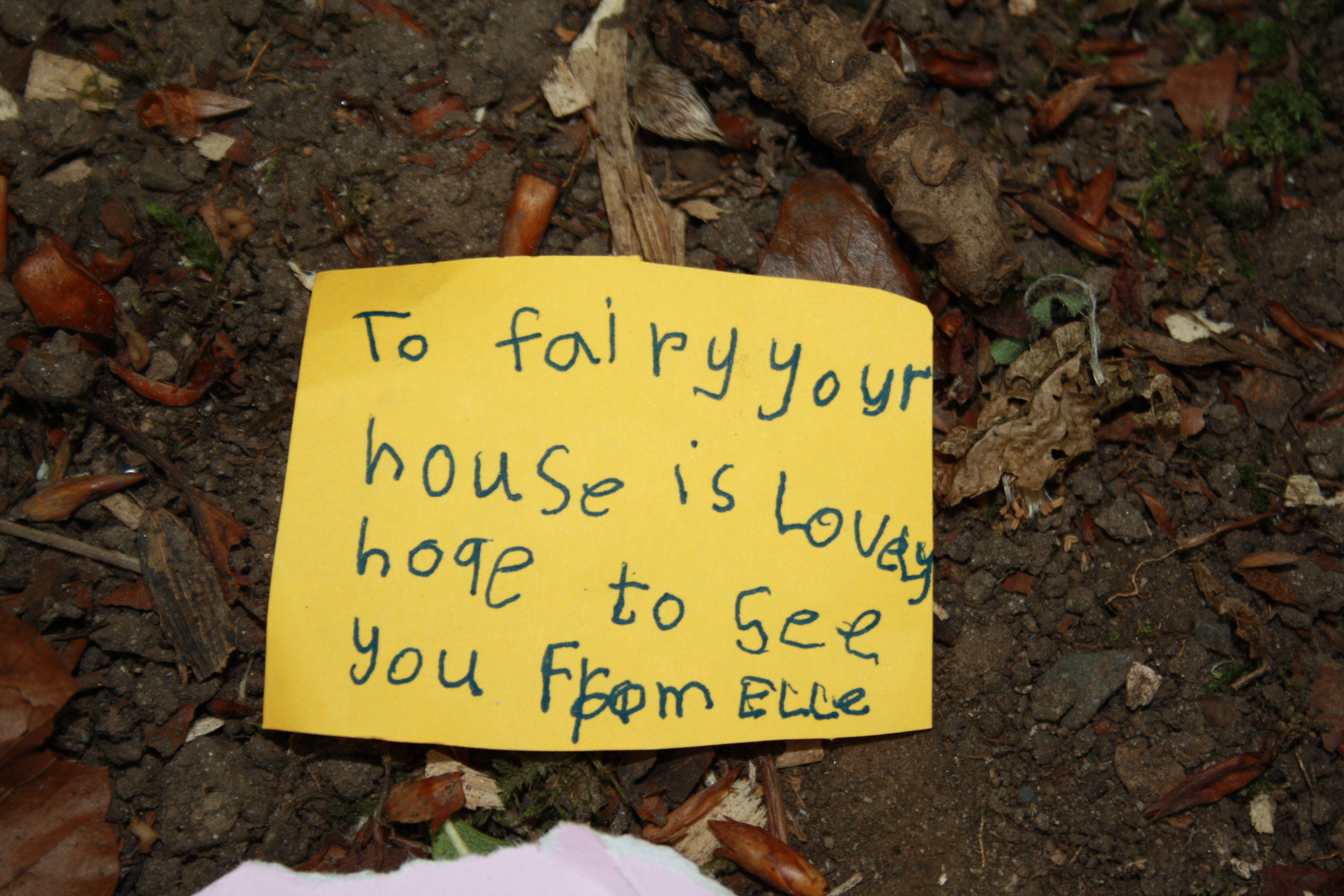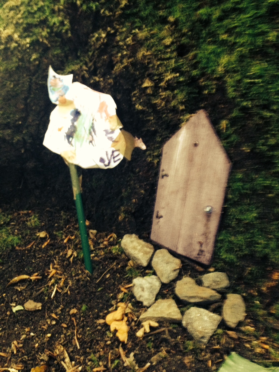 On our last visit, we noticed some children had left notes at the fairies’ doors, so Dylan and Eva decided they would like to draw some pictures for the fairies. Dylan drew a beach covered in snow with a palm tree (the dots are coconuts). Hmm…perhaps a little bizarre but cute nonetheless. Eva made a sign by sticking her picture of fairies to a pencil and signed her name below. Unfortunately, in Eva’s words (yells) ‘it got ruined!!’ as some juice was spilt on it, but we agreed the fairies would still love to have her picture outside their door and all was well again.